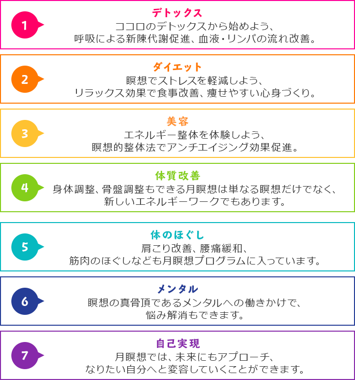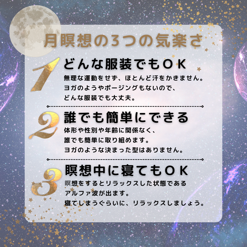 瞑想初心者の方から中級者、上級者の方まで、幅広くワンストップメニューで月瞑想を深めることができます。