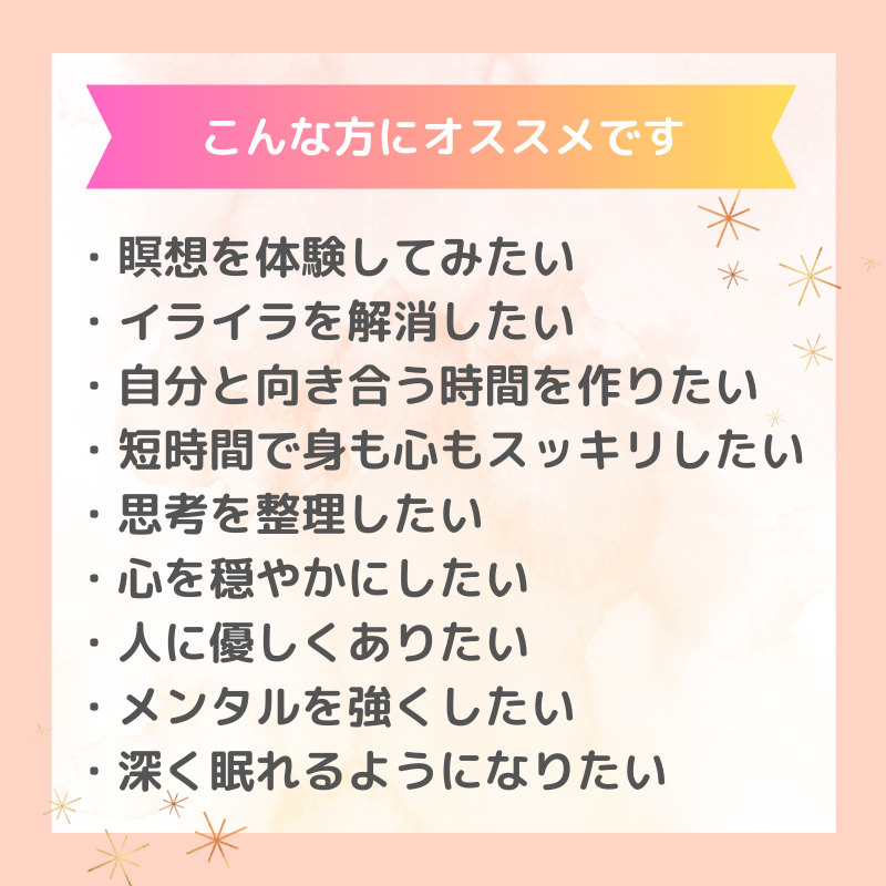 美容・ダイエット・健康促進・身体調整・メンタルデトックス・内観・インナービューティー・目的達成など、ワンメニューでできます。